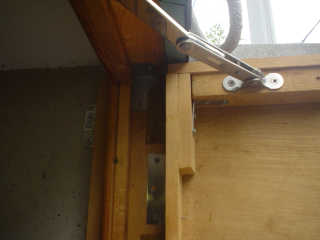 【1】1年半経過したドアの蝶番部分です。40×15mmの角材を2枚重ねにしていますが、どう考えても強度不足でした。