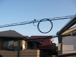 午前中に、業者が1人やってきてまず事前工事していた光ケーブルを電線から外します。電線そのものにはしごをひっかけて登るという離れ技を見せていただきました。